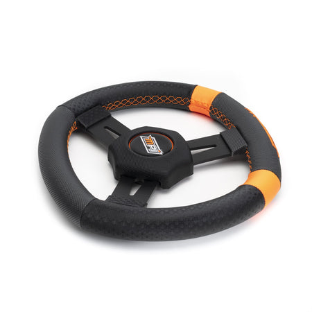 Steering Wheel, Quarter Midget, 10.75 in Diameter, Square, 1.25 in Dish, 3-Spoke, Synthetic Grip, Orange Stripes, Aluminum, Black Anodized