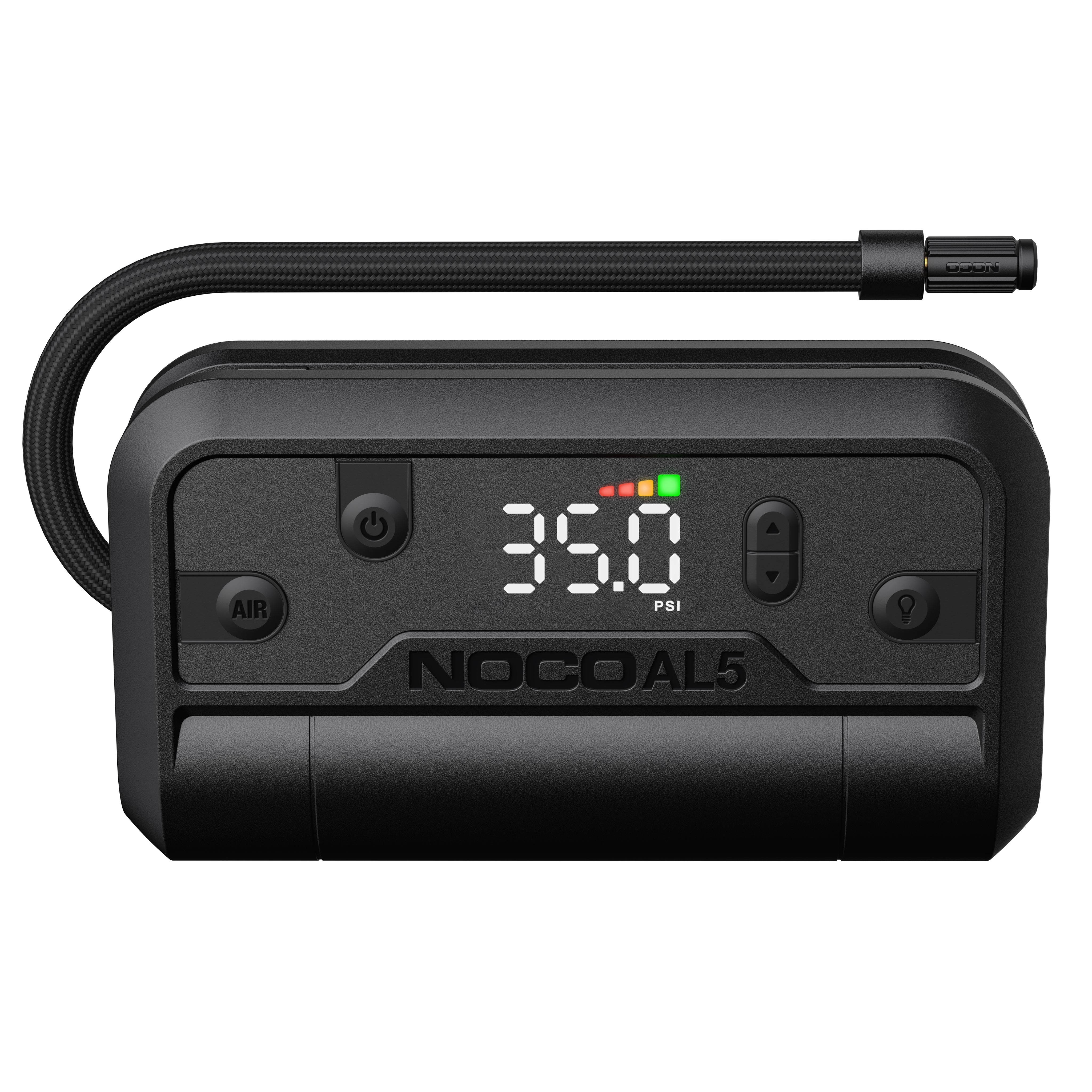 Introducing NOCO AL5 a 12-volt, 5-amp portable air compressor with a 90-watt motor rated at a maximum pressure of 130 PSI. AL5 is the next generation of portable air compressors, utilizing advanced motor and airflow design in an unbelievably compact form with uncompromising performance, it runs longer, fills faster, and is infinitely better.