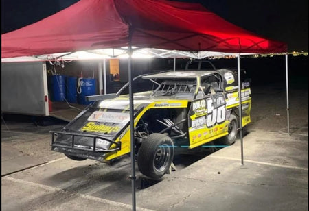 Illuminate your pit space with this high-output, easy to install lighting kit. Designed for quick setup at the track or in the garage, this kit ensures your canopy or workstation is bathed in clean, even light — ideal for maintenance tasks, driver prep, or late-day teardown. Lights are powered via single switchable plug and connect to each other via patch cords that are all included.